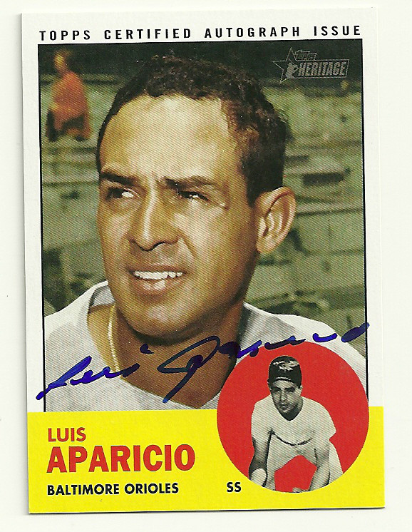 It’s playoff time, so we thought we would add a little baseball card flavor to October. The card in question is a 2012 Topps Heritage Luis Aparicio Real One Autograph. Luis played 18 seasons for the White Sox (two stints), Red Sox and Orioles. He was a great defensive shortstop and his speed was apparent by leading the AL in steals for nine consecutive seasons. Aparicio was voted to ten All-Star teams and won nine gold glove awards as well. He was inducted in the Hall of Fame in 1984.